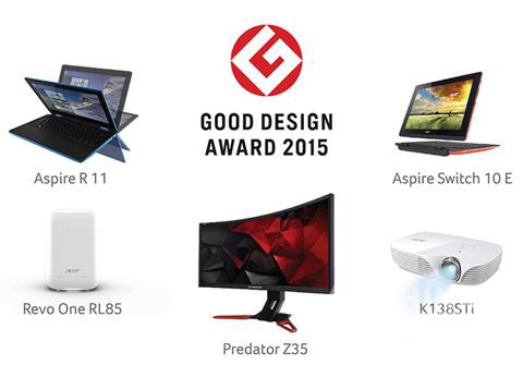 宏碁再度獲得2015年度國際產品設計大獎之一的Good Design獎項肯定,此次獲獎產品橫跨多元產品線,包括迷你 PC Revo One、可翻轉筆電Aspire R 11、二合一筆電Aspire Switch 10 E、曲面電競熒幕Predator Z35以及可攜式LED投影機K138STi。
