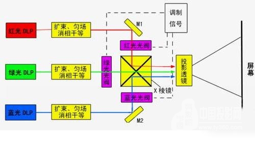 激光全色顯示技術(shù)以紅、綠、藍激光為光源,其工作原理如圖2,所示:紅、綠、藍三色激光分別經(jīng)過擴束、勻場、消相干后入射到相對應的光閥上,光閥上加有圖像調(diào)制信號,經(jīng)調(diào)制后的三色激光由X棱鏡合色后入射到投影物鏡,最后經(jīng)投影物鏡投射到屏幕,得到激光顯示圖像。