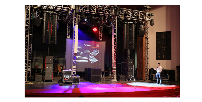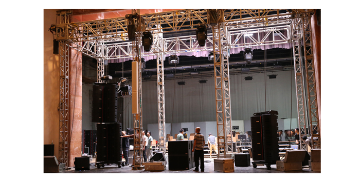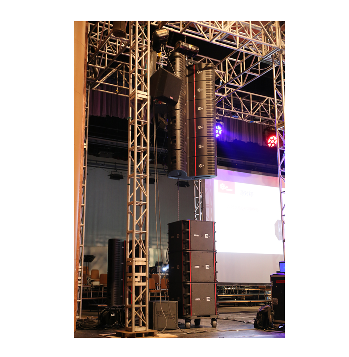 胡:視聽會26號下午2點正式開始,我們24號晚上就將設備運進場,25號早上搭設桁架,下午開始安裝和調試。主擴系統(tǒng)采用立體聲配置,我們在舞臺左右兩側各吊掛一個由6只Anya模塊構成的陣列,每個Anya陣列下面堆疊3只Otto模塊,提供更多的低音支持。