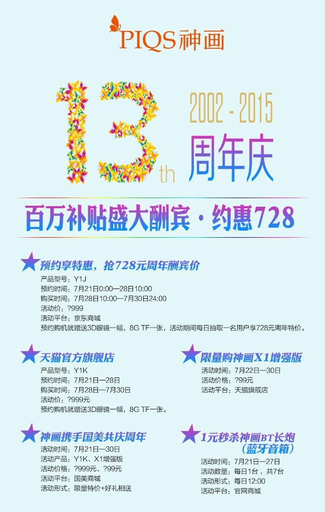 神畫將在京東商城、天貓官方旗艦店、所有經(jīng)銷商店鋪、國美、官網(wǎng)等平臺正式啟動周年慶典,屆時新品Y1J/Y1K都會以最大優(yōu)惠價*999元的價格發(fā)布,另外,神畫第一代具備自動對焦的產(chǎn)品X1增強版,將以*99元進行清倉大優(yōu)惠活動,而且購機即刻贈送3D眼鏡一幅+8G TF一張。同時,活動期間每日抽取一名用戶享728元周年特價,如果你和神畫有緣,或許那個幸運者就是你。值得注意的是:預約時間為7月21日0點—28日10:00,搶購時間為7月28日10點至7月30日24:00,此刻值得擁有無需剁手。7月21日—27日,官網(wǎng)商城更有1元秒殺神畫BT長炮(藍牙音箱)活動,名額有限,您準備好了嗎?