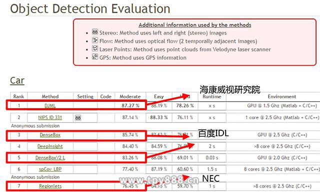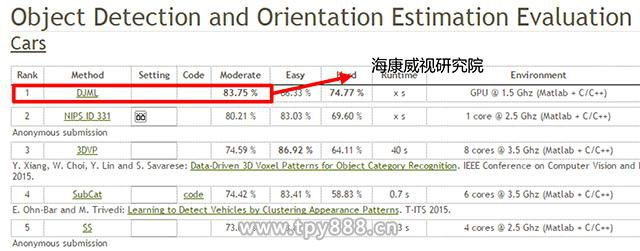 近日,海康威視研究院在KITTI評(píng)測(cè)中排名世界第一,表明其在計(jì)算機(jī)視覺算法上取得了重大突破。在車輛檢測(cè)和車頭朝向估計(jì)兩項(xiàng)任務(wù)中,分別取得了87.27%與83.75%的AP(Average Precision)值,均排名第一。參加這項(xiàng)評(píng)測(cè)的研究機(jī)構(gòu)及高校包括百度深度學(xué)習(xí)研究院、NEC北美研究院、加州大學(xué)等世界頂級(jí)研究團(tuán)體。