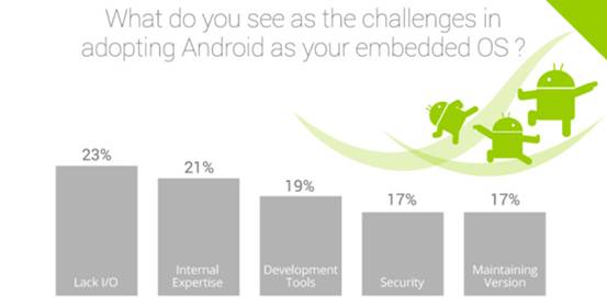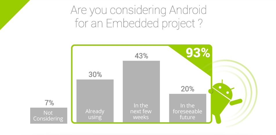 調(diào)查結(jié)果顯示,93%的受訪者表示會(huì)考慮在嵌入式服務(wù)中使用Android系統(tǒng)。其中30%的受訪者正在使用嵌入式Android系統(tǒng),43%的受訪者表示會(huì)在未來(lái)幾周投入使用。