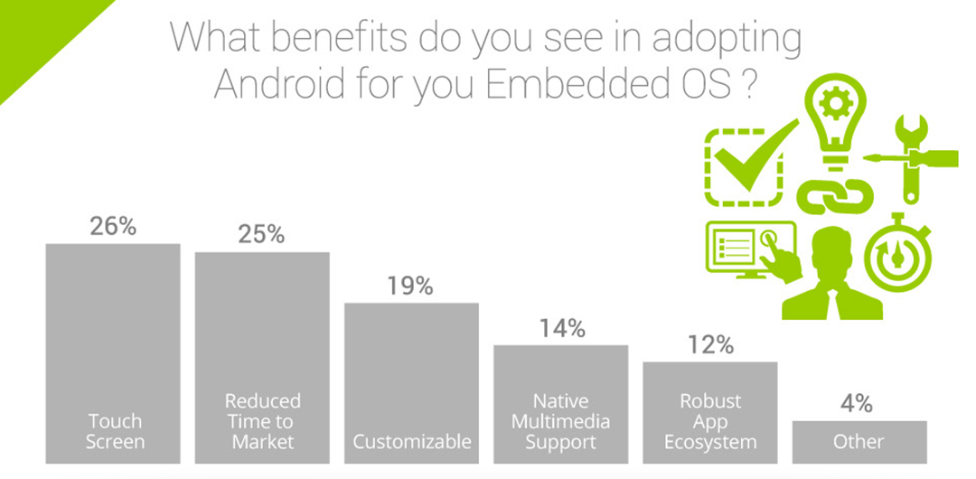 近50%的受訪者認(rèn)為,嵌入式Android系統(tǒng)主要適用于工業(yè)自動(dòng)化和車載娛樂系統(tǒng)中。 而數(shù)字標(biāo)牌、人機(jī)互動(dòng)和醫(yī)療也被認(rèn)為是嵌入式Android系統(tǒng)的重要應(yīng)用方向。