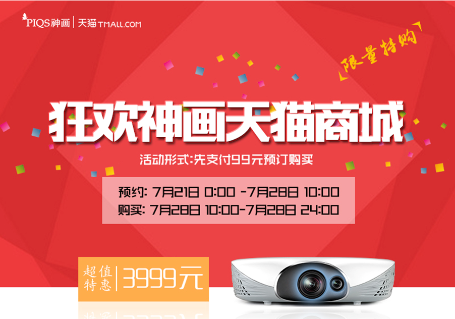 除了京東的特價(jià)預(yù)約活動(dòng)以外,神畫(huà)天貓官方旗艦店還進(jìn)行限量特購(gòu)狂歡活動(dòng),搶購(gòu)型號(hào)為神畫(huà)Y1K智能投影儀,活動(dòng)價(jià)格為3999元,活動(dòng)形式同樣為預(yù)定+搶購(gòu),預(yù)付定金時(shí)間為7月21日0點(diǎn)至28日10:00,支付尾款時(shí)間為7月28日10點(diǎn)至7月30日24:00。近期想購(gòu)買(mǎi)神畫(huà)智能投影儀的朋友千萬(wàn)不要錯(cuò)過(guò)。