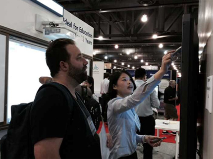 據(jù)現(xiàn)場工作人員介紹,針對教育市場需求,現(xiàn)場展示的產品都有針對性的特色。比如,作為東方中原2015年扛鼎之作的派克斯PROPIX激光投影機,不僅具有高分辨率、高亮度、高對比度等顯示特色,更具有長達2萬小時的壽命,能夠很好的滿足日常教學長時間使用的需求,有效降低學校的教學成本;與激光投影機配套的大屏幕紅外電子白板,則完全能夠滿足課堂教學的寬屏顯示需求,支持大尺寸互動演示,迎合日益高漲的互動教學潮流;現(xiàn)場展示的液晶觸摸一體機,針對教學應用的易用性需求,采用了雙系統(tǒng)設計,并有一鍵節(jié)能、觸控喚醒等人性化功能。