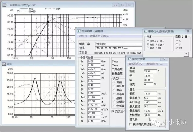 2、關(guān)于雙峰的高度,這里以lspcad自帶的數(shù)據(jù)庫中的peerless六寸半單元831975為例,做一個(gè)倒相箱設(shè)計(jì)模擬,按常用的QB3響應(yīng)設(shè)計(jì),得到下圖的結(jié)果: