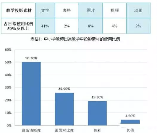 清華大學(xué)信息化技術(shù)中心針對全國19個省市自治區(qū)約2300名中小學(xué)教師進行了深入的調(diào)研,并完成了《中國中小學(xué)教師投影使用現(xiàn)狀及偏好調(diào)查報告》。結(jié)合2014年發(fā)布的報告,文字是當(dāng)前中國廣大教育用戶使用比例最高的投影內(nèi)容,為了清楚呈現(xiàn)文字的投影效果,“對比度”成為了中國院校教學(xué)投影的重要需求,也為中國院校投影機采購帶來了切實的指導(dǎo)意義。