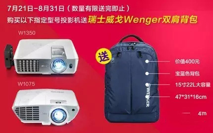 本次明基暑促自7月21日開始至8月31日截止。在此期間,成功搶得W1350或W1075任一款專業(yè)全高清全3D家庭影院投影機,便可贏得寶藍色15寸瑞士Wenger多功能雙肩背包一個,外觀時尚有型,超輕透氣防水。