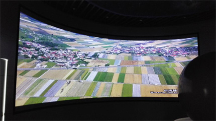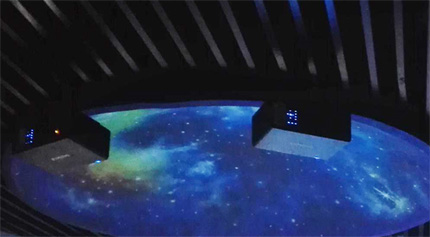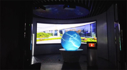它打破了以往投影圖像只能是平面規(guī)則圖形的局限,利用特殊的光學鏡頭,將普通的平面影像進行特殊的變換,投射到一個球形的屏幕內,形成一個內投的球體影像。內投球采用高流明的投影機,高分辨率技術可以播放各種經過視頻變幻的影像,使整個球體看起來就像一個科幻的大球,可以很好的吸引參觀者的眼球,該產品主要應用于科普教育、展覽展示、廣告娛樂和虛擬仿真等領域。本球幕通過3臺視美樂SML-PF500工程投影機采用多機疊加,實現(xiàn)亮度提高,圖像無損的顯示效果。將球幕亮度提高三倍,完美解決現(xiàn)場環(huán)境光過高的缺憾。