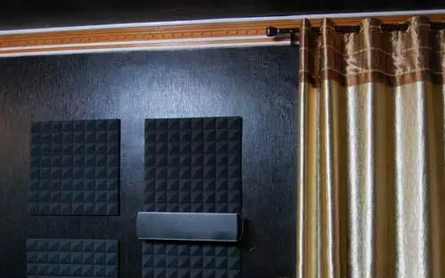 對于吸音,還用了十塊金字塔形吸音海綿,貼在第一反射點與后環(huán)繞處,價格便宜(一塊38元),施工簡單。