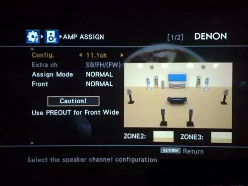 為了打消一些人的疑惑,下午特地跑回家拍了4810的菜單。有圖有真相!這是放大器設置項的11.1聲道擺位圖.下面的一行英文意思是“必須前級輸出增寬聲道”。因為4810只內置了9聲道的放大,所以必須將增寬聲道接后級才能實現(xiàn)11聲道的輸出。