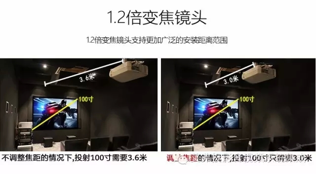 鏡頭手動(dòng)1.2倍變焦(投射比:1.47-1.77:1),手動(dòng)對(duì)焦,F(xiàn) =2.1-2.25,f=19.11-22.94 mm