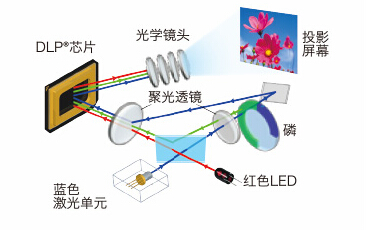 將紅(高亮度紅色LED)、綠(藍色激光通過熒光體轉(zhuǎn)換為綠色)、藍(藍色激光)三色,通過DLP®芯片投影,通過加入激光,從而打破了以往LED技術(shù)瓶頸,跨過了低流明度的鴻溝,做到了不使用高壓水銀燈泡而實現(xiàn)高亮度投影。