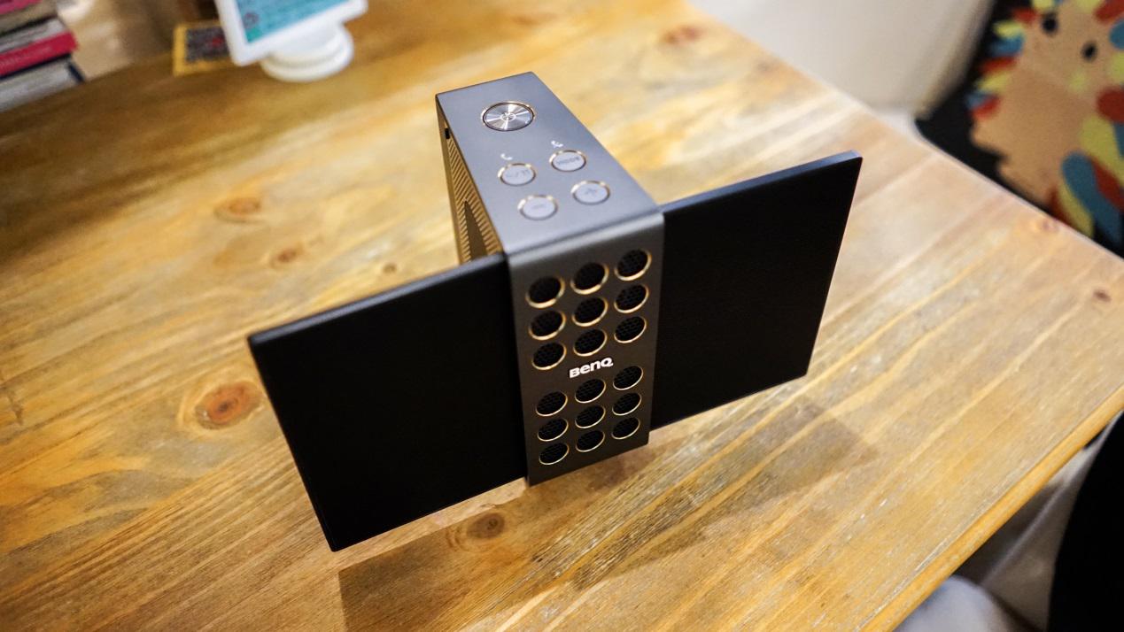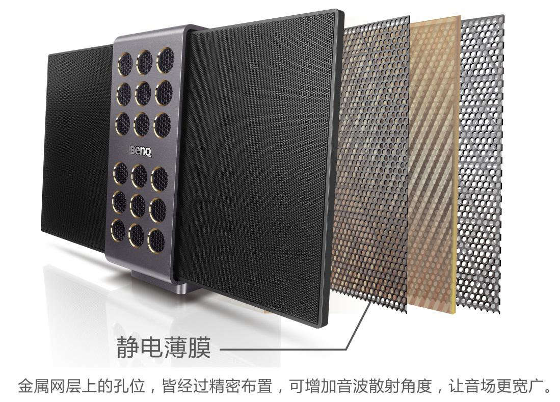 BenQ treVolo的兩翼可折疊式設計打破傳統(tǒng)箱體式的呆板作風,讓聲音在不受箱體共振的影響下完全釋放聲音本色。正面是蜂巢式的金屬面板,而靜電薄膜揚聲器則像翅膀一樣,可以收起和展開,以此來實現便攜性。
