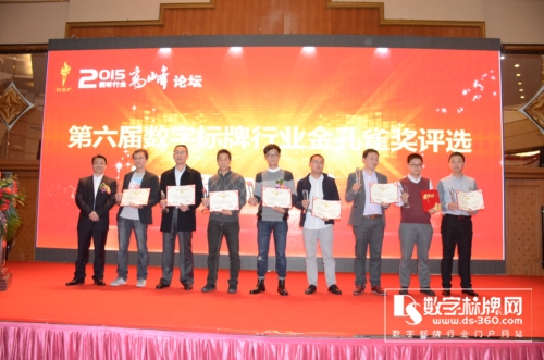 深圳打令智能科技有限公司 主題:打令品牌及產(chǎn)品介紹 在隨后的數(shù)字標(biāo)牌行業(yè)高峰論壇中,來自數(shù)字標(biāo)牌行業(yè)的6位精英代表(從左至右):迅豹聚能科技王培勇、艾爾鵬國際貿(mào)易上海有限公司廖華麟、保千里科技視像集團(tuán)股份有限公司陳楊輝、中銀科技柯金成、南京中電熊貓聶文強(qiáng)、康佳壹世界商業(yè)顯示有限公司衛(wèi)智敏就數(shù)字標(biāo)牌整個(gè)商業(yè)零售業(yè)變革以及智慧城市等趨勢下,數(shù)字標(biāo)牌行業(yè)未來發(fā)展方向展開激烈的思想交鋒與碰撞! 在萬眾期待的數(shù)字標(biāo)牌行業(yè)年度最高榮譽(yù)金孔雀獎(jiǎng)?lì)C獎(jiǎng)典禮中, 30多家數(shù)字標(biāo)牌行業(yè)杰出企業(yè)加冕行業(yè)最高榮譽(yù)“金孔雀獎(jiǎng)”。