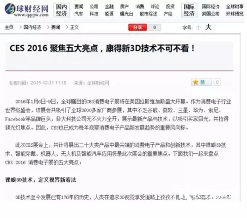 CES 2016是一個(gè)世界級頂尖創(chuàng)新和展示舞臺(tái),對于意欲將裸眼3D技術(shù)推向全球的康得新來說,這無疑是極好的機(jī)遇。在用戶對于3D剛性需求基礎(chǔ)上,在行業(yè)的共同努力下,康得新正在乘勢而上,以“中國制造”走出國門,走向世界創(chuàng)新平臺(tái),引領(lǐng)全球3D發(fā)展新格局。