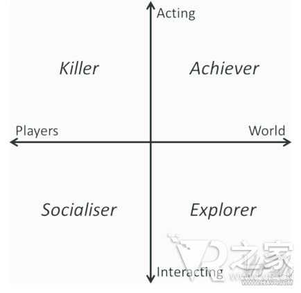 在休閑游戲玩家的范疇里,研究者可以看到四個(gè)象限或“類(lèi)型”。分別為殺手、成功者、社交者、探險(xiǎn)家。