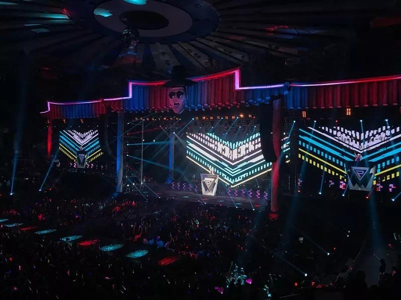 其中深入到現(xiàn)場(chǎng)觀眾人群的“T”型舞臺(tái),能近距離接觸觀眾,與觀眾進(jìn)行實(shí)時(shí)互動(dòng)。特別是其中由定制升降舞臺(tái)組成的部分,更是鳥叔演唱會(huì)的大殺器,不僅覆蓋表演區(qū)和遠(yuǎn)景區(qū),還帶來了十分震撼的現(xiàn)場(chǎng)效果,一下就將演唱會(huì)氣氛推向高潮。
