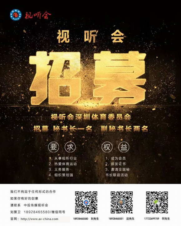 視聽(tīng)會(huì)擬成立視聽(tīng)會(huì)深圳體育委員會(huì),現(xiàn)招募秘書(shū)長(zhǎng)一名,副秘書(shū)長(zhǎng)兩名。