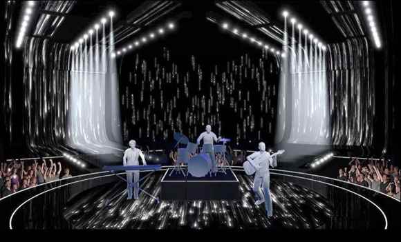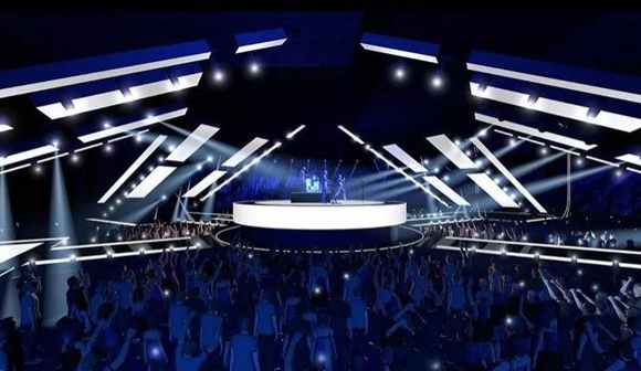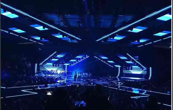 圓形舞臺頂部安裝了led屏幕與燈光裝置,與可升降全息幕布,以此來增強(qiáng)舞臺的空間感與科技感。