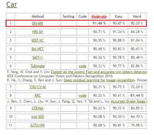 近日,大華股份基于深度學(xué)習(xí)技術(shù)研發(fā)的目標(biāo)檢測技術(shù),刷新了The KITTI Vision Benchmark Suite中2D車輛類目標(biāo)檢測任務(wù)(2d object Detection Evaluation)的全球最好成績,取得了2D車輛類目標(biāo)檢測排行榜第一名,超越一流的AI公司和頂尖的學(xué)術(shù)研究機構(gòu),以及CVPR 2017與2018年度最佳目標(biāo)檢測研究成果,這標(biāo)志著大華股份在目標(biāo)檢測領(lǐng)域處于世界領(lǐng)先水平。