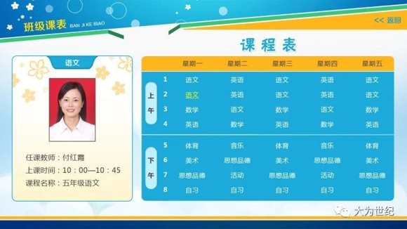 大為世紀電子班牌擁有專業(yè)性、安全性、交互性和獨立性的特點,其系統(tǒng)功能包括了多媒體展示、教務信息展示、教務考勤功能、問卷調(diào)查功能等。根據(jù)學校的需求,班牌可以展示班級信息、班主任信息、班級宣傳文化、班級活動照片、學校通知公告,同時可以導入或者對接學校的教務系統(tǒng),展示班級當日課程表、當前課程信息、出勤結果信息等。