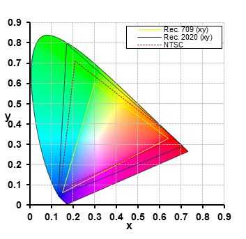一個畫面準確一致地再現(xiàn)另一個畫面中的某種顏色,就需要定量測量。這是色域概念開始發(fā)揮作用的地方。色域表示給定系統(tǒng)可以產(chǎn)生的所有不同顏色。不同的色域標準(如國際電信聯(lián)盟建議(ITU-R)的Rec.709和Rec.2020,國家電視系統(tǒng)委員會(NTSC))定義了不同數(shù)量的色譜,可通過復制以達到兼容。這些標準為每種顏色分配了其專屬的顏色坐標,并確保在一個畫面復制的顏色在另一臺顯示上看起來完全相同。每個標準定義的色域在XY色度圖上顯示為三角形,如圖3所示。這些三角形顯示了由直線連接的峰值紅-綠-藍(RGB)坐標。