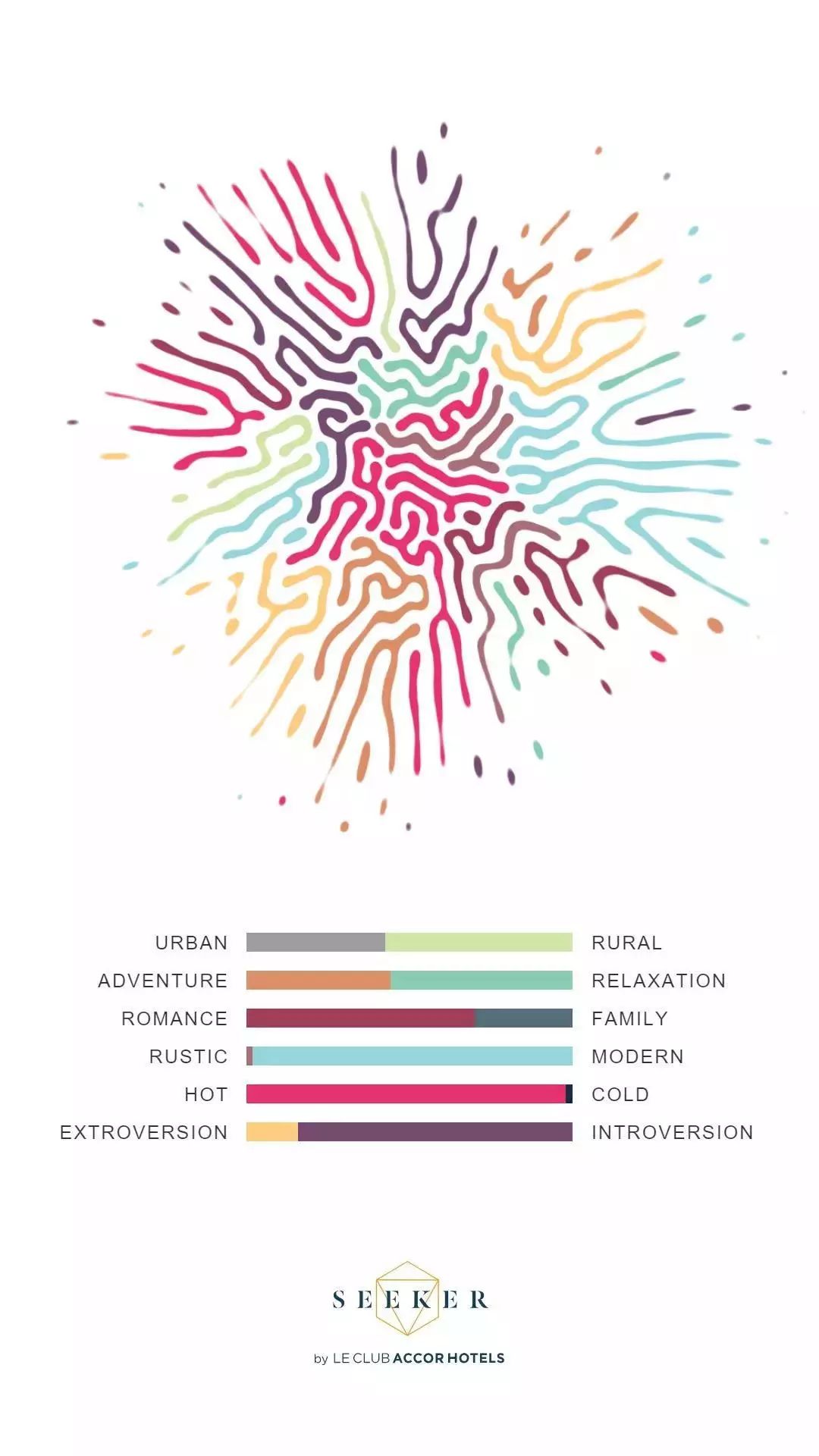 最后,算法會(huì)計(jì)算出六個(gè)關(guān)鍵指標(biāo)并以可視化的形態(tài)表示出來:城市或鄉(xiāng)村,冒險(xiǎn)或輕松,浪漫或家庭,自然或現(xiàn)代,熱或冷,外向與內(nèi)向。每個(gè)人都可以得到像指紋一樣獨(dú)一無二的個(gè)性情感畫像和旅行資料,可以據(jù)此為你建議符合相同指標(biāo)的旅行目的地。