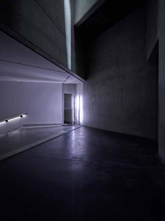 杜塞爾多夫概念藝術(shù)家米舍·庫爾的作品“光與聲:共鳴(Light and Sound:res·o·nant)”,占據(jù)了柏林猶太博物館地下一層占地350平米的空間,包括了兩個垂直的完全空洞的區(qū)域。這兩個留白區(qū)域高度達(dá)24米,抬頭可以在看到天花板的玻璃外的天空。藝術(shù)家使用旋轉(zhuǎn)式投影,將燈光投射在墻壁、地面和天花板上來回移動。并通過鏡子的反射和頻閃式光脈沖,創(chuàng)造出明暗的變化。