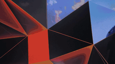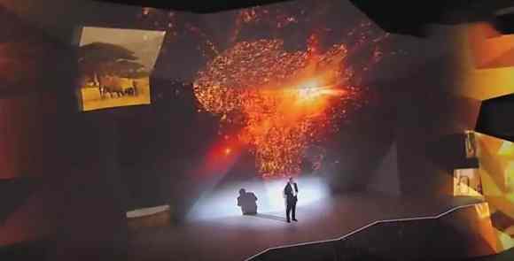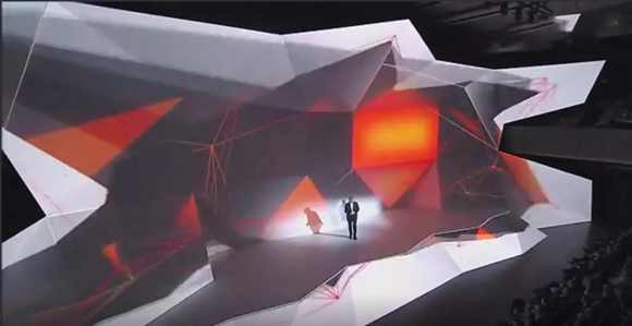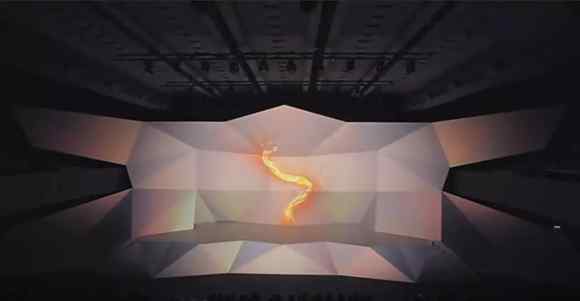 你眼前的巨大異形屏幕,就像一個(gè)棱角錯(cuò)落的洞穴一樣,吸引者你的目光,主持人如約登場,在這片又光線和色塊任意組成的背景之下,視頻內(nèi)容中的城市,人物,照片墻的匯聚,都呈現(xiàn)出了多維立體的視覺效果