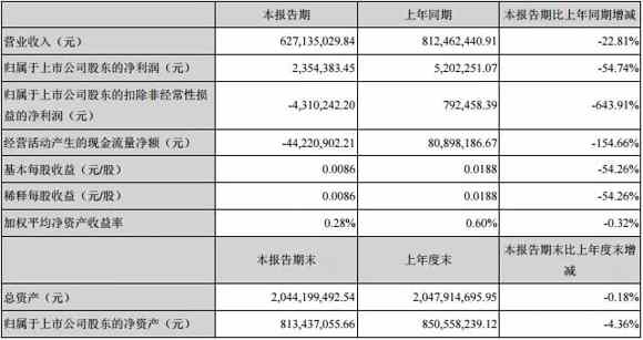 8月23日,茂碩電源發(fā)布2018年半年報稱,公司2018年1-6月實現(xiàn)營業(yè)總收入627,135,029.84元,同比下降22.81%;歸屬于上市公司股東的凈利潤為2,354,383.45元,同比下降54.74%,主要系較上年同期減少FPC業(yè)務(wù)導(dǎo)致;公司傳統(tǒng)主業(yè)較上年同期基本持平。