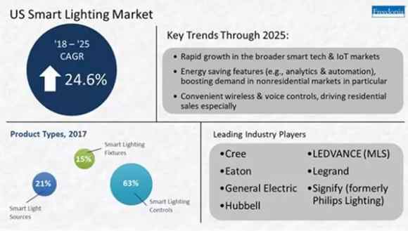 根據(jù)Freedonia Group的一份新報告,預(yù)計到2018年底,美國對智能照明的需求(包括光源,燈具和控制裝置)將增加到9.45億美元。市場研究公司表示預(yù)計到2025年,美國智能照明系統(tǒng)銷售額達到44億美元。
