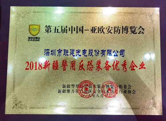 展會(huì)期間,聯(lián)建光電斬獲2018新疆警用反恐裝備優(yōu)秀企業(yè)獎(jiǎng)。