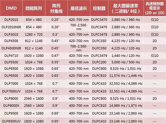 表1:可以顯示有用的3D掃描規(guī)范的DLP芯片組組合