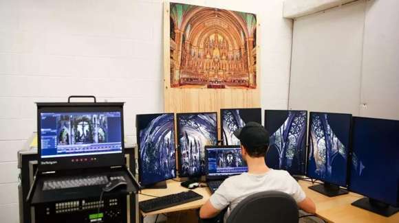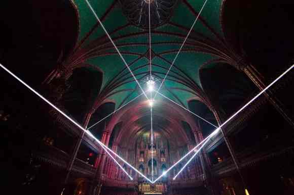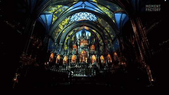 在蒙特利爾建城375周年的紀(jì)念日,這座城市的標(biāo)志建筑圣母大教堂舉辦了一場(chǎng)名為“AURA(頭上光環(huán))”的聲光秀,大膽地使用燈光投影來(lái)凸顯圣母大教堂的華美和壯麗。