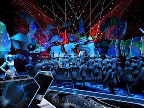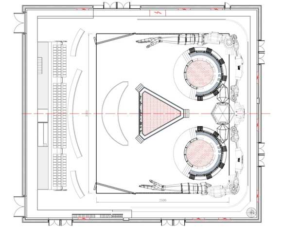 作為一檔貼近年輕群體的音樂(lè)節(jié)目,舞美整體設(shè)計(jì)偏向年輕化又極具科技感。兩個(gè)樂(lè)隊(duì)在對(duì)稱(chēng)方向的“飛碟”上進(jìn)行表演,中間設(shè)有可供表演的三角形嘉賓區(qū),弧形的評(píng)論區(qū)結(jié)合演播廳兩側(cè)的機(jī)械臂膀,最終形成未來(lái)感十足的機(jī)器人造型。
