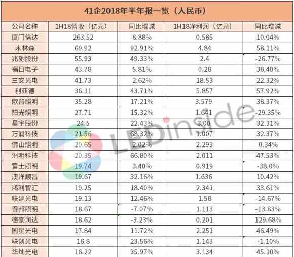 時至八月末,A股上市企業(yè)中報披露已接近尾聲。近期LED上中下游相關(guān)企業(yè)扎堆交出2018年半年度成績單。據(jù)LEDinside不完全統(tǒng)計,截至8月31日,累計共有41家LED相關(guān)企業(yè)披露了業(yè)績,頗具看點(diǎn)。LED上中下游的代表三安光電、木林森及歐普照明紛紛交出亮眼業(yè)績單。
