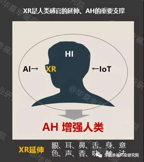 要想看透XR在各個(gè)垂直領(lǐng)域的應(yīng)用,首先應(yīng)看懂XR如何塑造AH(增強(qiáng)人類)——人與AI、XR、IoT三者結(jié)合后,感知、判斷、決策、執(zhí)行能力得到全面提升和強(qiáng)化,其中,AI需與HI(人類智能)充分結(jié)合,IoT把物體數(shù)據(jù)傳輸給人,XR則通過改善、放大或延伸眼、耳、鼻、舌、身、意等感知能力來幫助人類捕捉虛實(shí)疊加的世界。