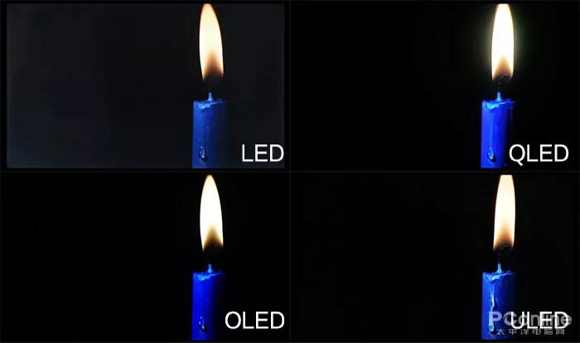 從圖片中明顯可以看出,OLED屏幕顯示黑色背景十分純粹,用LED背光源的LCD電視,背景則顯得灰白,不夠純粹,QLED屏幕在蠟燭火焰處不夠干凈純粹,ULED雖然處理得很好,但在藍色蠟燭上顯示還是不如OLED。