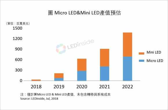 在2018年8月底登場(chǎng)的智能顯示與觸控展(Touch Taiwan 2018),更首度新增了「MicroLED/MiniLED產(chǎn)品與解決方案」主題專區(qū),眾臺(tái)灣地區(qū)LED與面板大廠皆參戰(zhàn)展示最新技術(shù)與解決方案。根據(jù)研究機(jī)構(gòu)LEDinside報(bào)告預(yù)估,至2022年Micro LED以及Mini LED的市場(chǎng)產(chǎn)值將會(huì)達(dá)到13.8億美元。