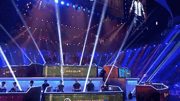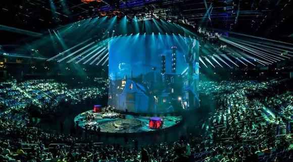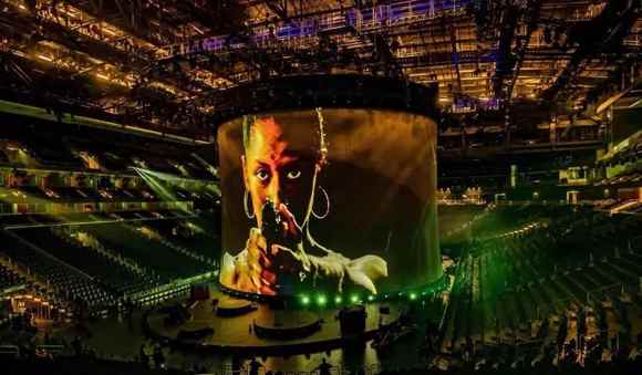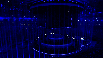 舞臺(tái)中心有個(gè)巨大的360°圓柱紗幕,《絕地求生》的場(chǎng)景不斷的在投影幕墻中變換。