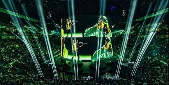 舞臺(tái)地面被投影出崎嶇的路面或茂密的叢林,還有假石頭和吃雞專(zhuān)用車(chē)等道具讓其更加逼真。現(xiàn)場(chǎng)對(duì)于城市交戰(zhàn)、野外對(duì)決和叢林場(chǎng)景中不同顏色光束的使用也是精心設(shè)計(jì)的,簡(jiǎn)直是完美復(fù)刻了游戲場(chǎng)景。