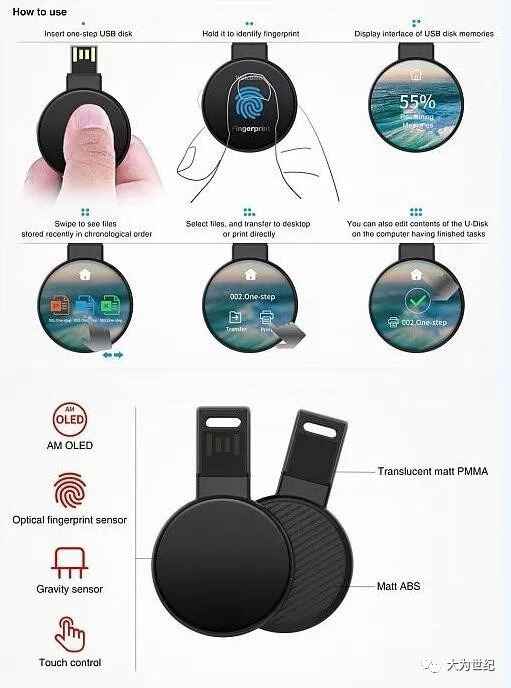這款名為One-Step的智能U盤是針對人們拷貝資料時內存不足,無意丟失U盤導致信息泄露等問題,通過將現(xiàn)有的重力傳感器,屏下指紋識別,OLED等技術與Shake、Hold、Touch手勢相結合,做到內存顯示只需隨時一搖,指紋解鎖只需隨手一按,文件快速打印與轉移只需隨心一觸。One-step智能U盤提供的整合性解決方案,為用戶帶來全新有趣,前瞻性的交互體驗。 設計:Xingxu Chen,Prof.Shaoping Guan&Jing Yang