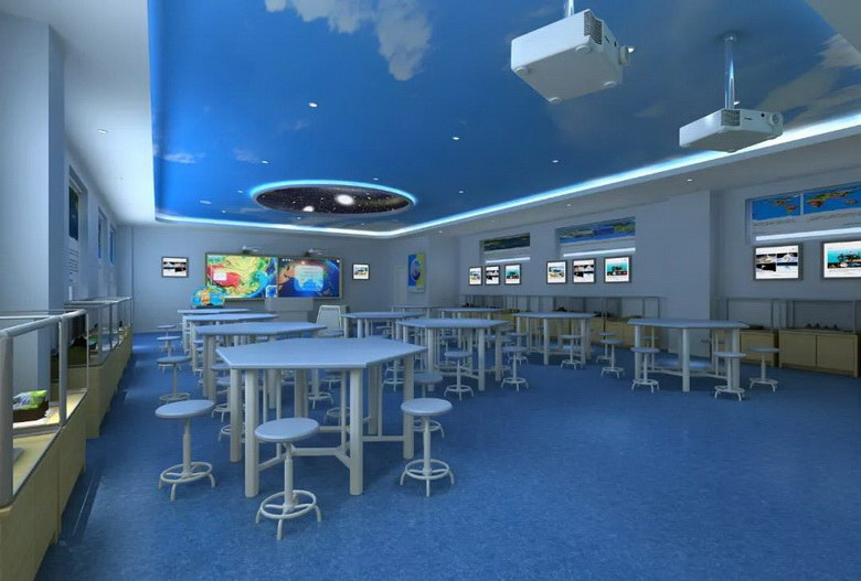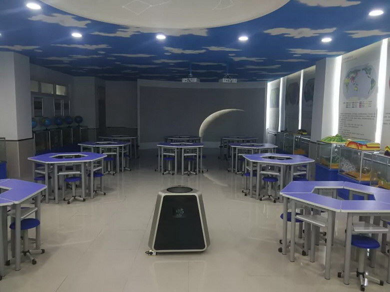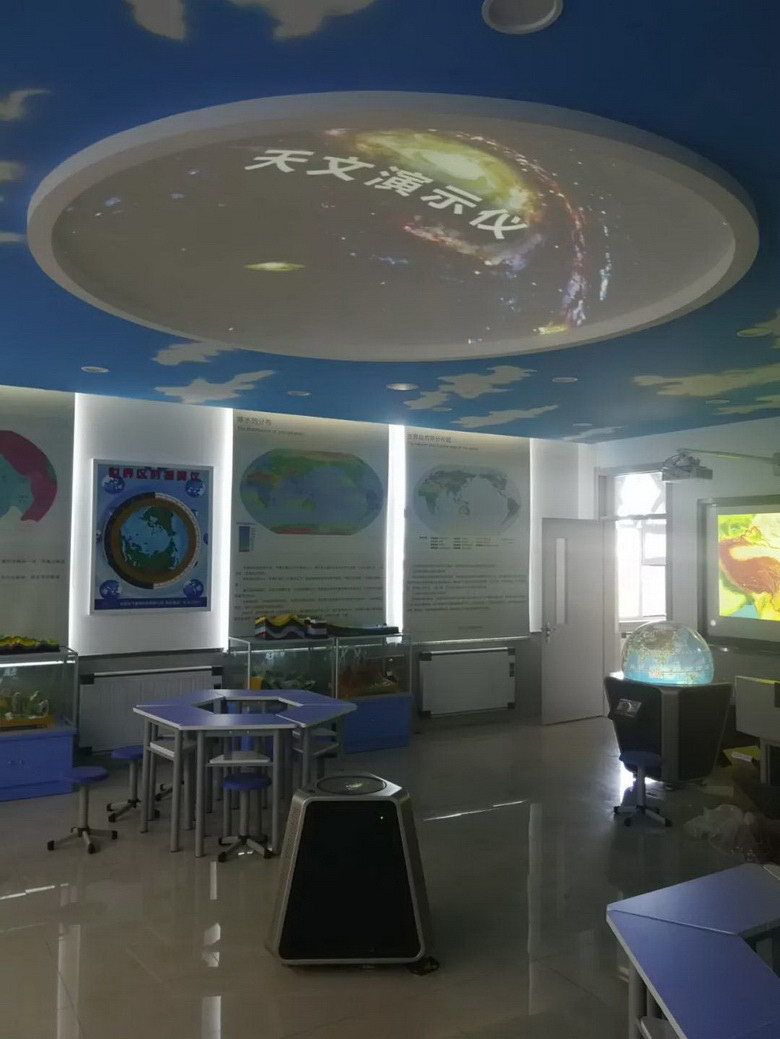 天文演示儀在天花板上投影出一個(gè)圓形的演示穹頂。將學(xué)生的視角由地球范疇,轉(zhuǎn)向太空乃至整個(gè)宇宙,將地理知識(shí)與天文教學(xué)有效整合,使學(xué)生了解地月系、地球與太陽系、地球與銀河系之間的關(guān)系,了解恒星、行星的形成及宇宙的演變過程。