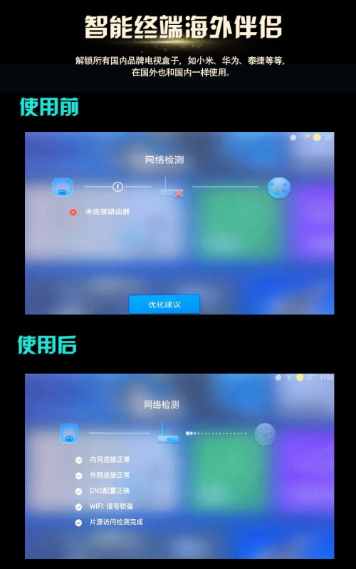 C+路由器就是一款專為海外華人研制,可以解鎖電視盒子、解除音視頻軟件國外使用的特殊路由器。,配上這款神器,小米盒子、小愛同學(xué)等國內(nèi)智能終端統(tǒng)統(tǒng)沒有問題,就和在國內(nèi)一模一樣使用。