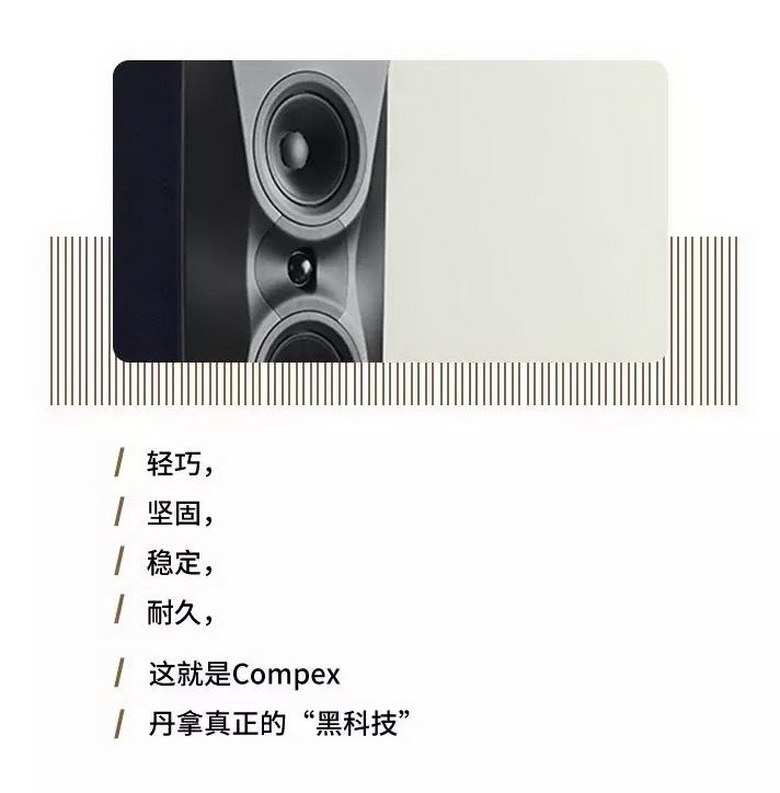 Compex是一種新型復(fù)合材料。這種神奇的材料擁有完美的阻尼,自身幾乎沒(méi)有諧振,如果你輕輕敲擊它,會(huì)發(fā)現(xiàn)沒(méi)有任何回聲。這充分表明Compex擁有極強(qiáng)的聲學(xué)惰性和振動(dòng)吸收能力,不但能有效抑制單元產(chǎn)生的不良振動(dòng),還可以很好地隔絕低音單元對(duì)中,高音單元產(chǎn)生的振動(dòng)影響,使所有單元發(fā)揮最佳水平。