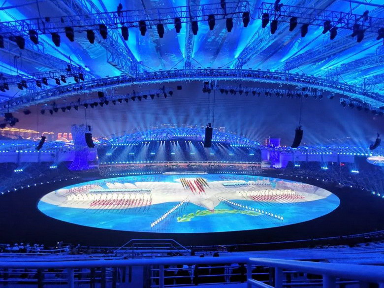 這是一次和平的慶典,更是所有軍人的榮耀。軍運(yùn)會(huì)組委會(huì)用了最高標(biāo)準(zhǔn)籌備本場盛會(huì)。開幕式采用了國內(nèi)首創(chuàng),也是世界上最大的全三維立體式舞臺(tái)。充分利用有限空間,通過高新技術(shù)實(shí)現(xiàn)舞臺(tái)的多維擴(kuò)展。現(xiàn)場大面積使用了投影技術(shù),通過多媒體影像互動(dòng),完成了360度全景式、立體式空間表演。