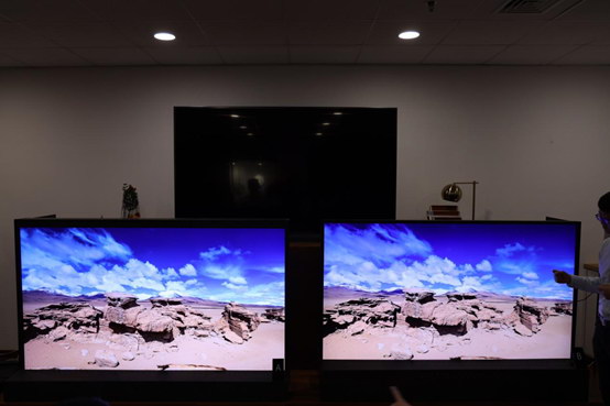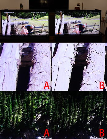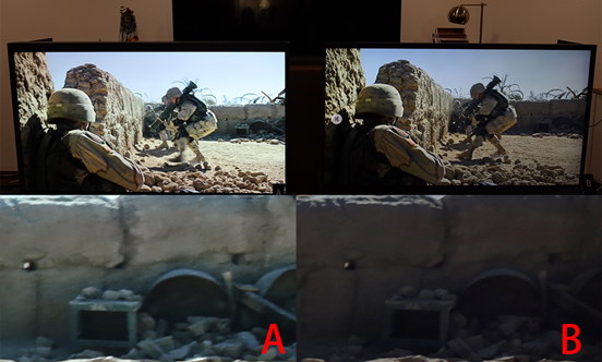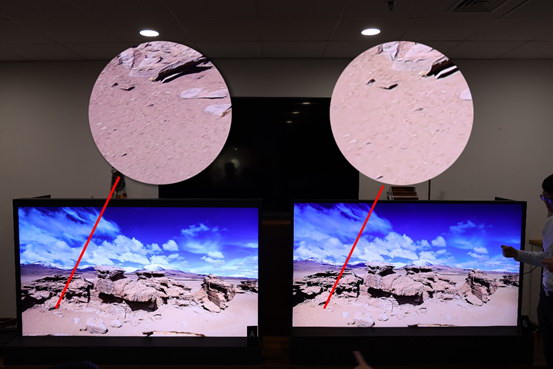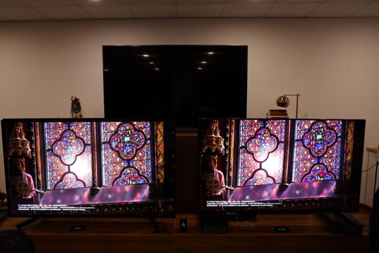 此外,在畫面中間最亮的區(qū)域,右側(cè)電視完全過曝顯得很亮,左側(cè)電視則能看清楚高亮區(qū)域中的畫面細(xì)節(jié)。