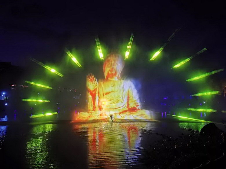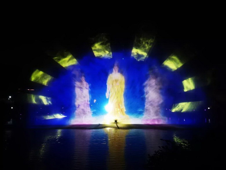 同樣,“根宮夜宴”的“水幕電影”場景也是由鴻合工程團隊,采用NEC PH3501QL+工程投影機打造,精彩紛呈的投影燈光秀,與環(huán)繞四周的“萬佛歸宗”、上空的“空中佛影”等場景,形成一個整體,全方位、多維度的光影融合,帶來一場震撼人心的視聽盛宴。