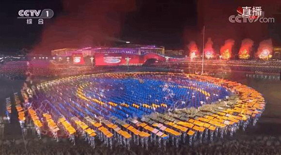 3000多名聯(lián)歡群眾演員跟著音樂的旋律,流動著拼組出“巍峨的長城”、“飄曳的風(fēng)箏”、“展翅的和平鴿”、“飄動的五星紅旗”等令人嘆為觀止的主題巨幅動圖,象征著全國人民攜手共筑中國夢的美好寓意。